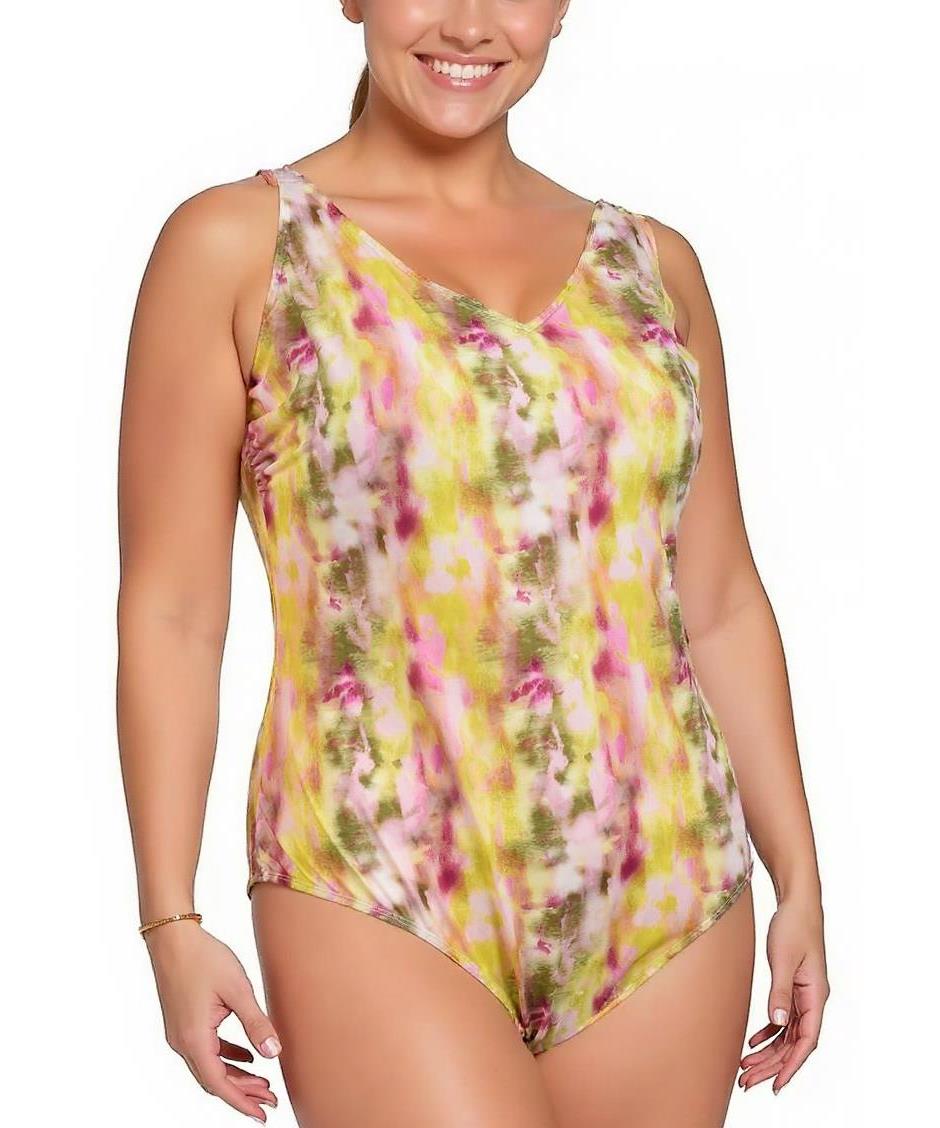 Дамският цял бански е с модерен дизайн с пъстри абстрактни мотиви в жълти, розови и зелени тонове. Материята е мека и комфортна, осигуряваща удобство и стил за летните дни на плажа.