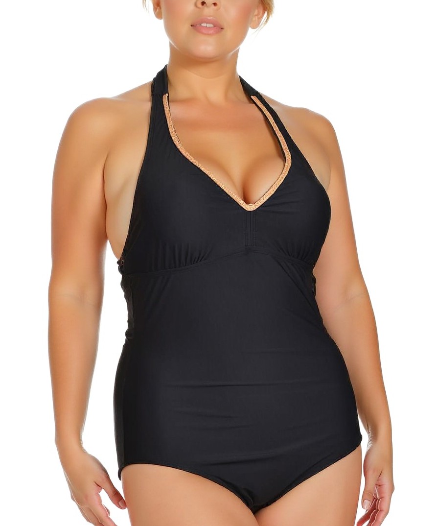 Дамски цял бански в черен цвят с дълбоко деколте и връзка през врата. Изработен от еластична материя, осигуряваща комфорт и поддръжка. Подходящ за плажни и басейни приключения.