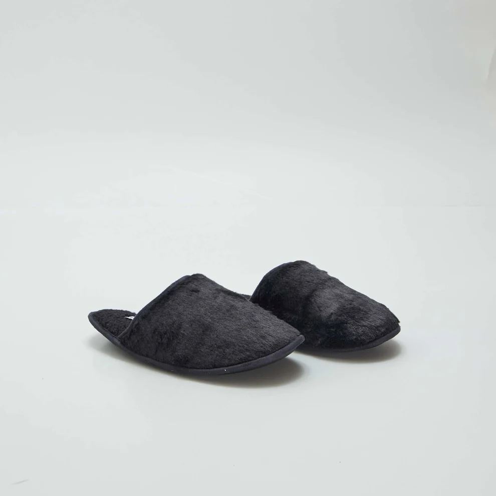 Елегантни дамски домашни чехли в черен плюш, меки и топли, с леко омекотена стелка и нехлъзгаема гумена подметка. Удобни за вкъщи, лесни за обуване и поддържане. Предлагат се номера; машинно пране. XL