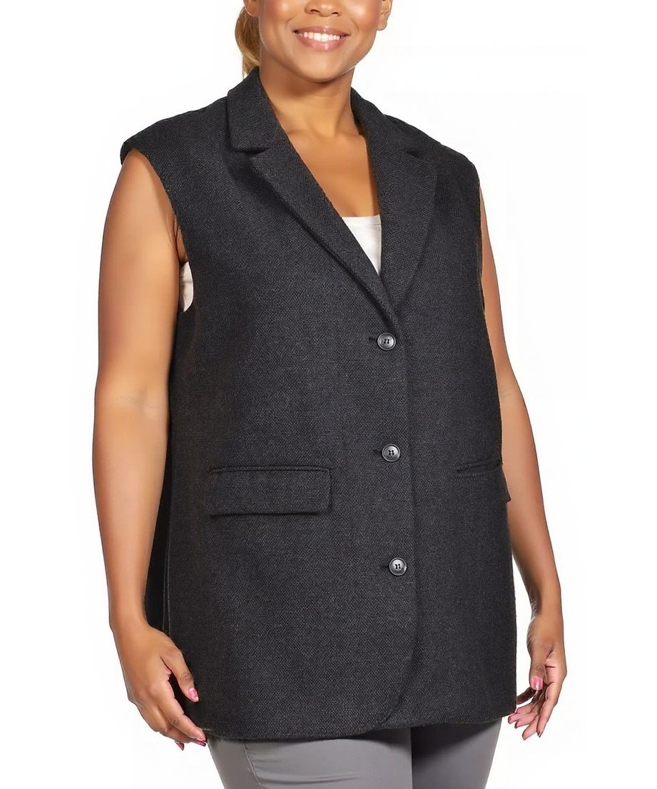 Мек дамски елек от вълна с ревери, три копчета и дискретни джобове. Топъл, структуриран силует за многослойни визии, меко чувство, подходящ за офис и ежедневие в тъмен нюанс. Лек и класичен. Моден