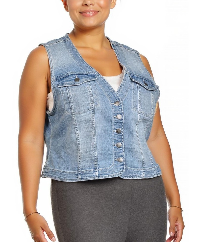 Дамски памучен елек в светъл деним, безръкав, с метални копчета отпред и джобчета на гърдите. Леко вталена и удобна кройка за ежедневни и непринудени летни визии. Подходящ за плюс размери лесна поддръжка