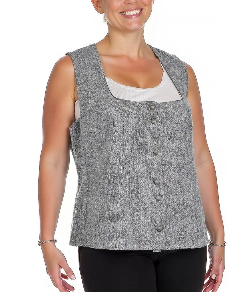 Дамски елек от вълнена смес, сива класическа кройка без ръкави, закопчаване с метални копчета. Топъл и мек, идеален за студено време; стилен избор за офис и ежедневие. Лесен за поддръжка и съчетаване.