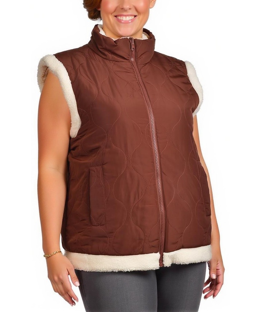 Двулицев дамски елек: едната страна капитонирана, водоотблъскваща с цип и джобове; другата — пухкава изкуствена агнешка вълна. Топъл, удобен и стилен за ежедневно носене.