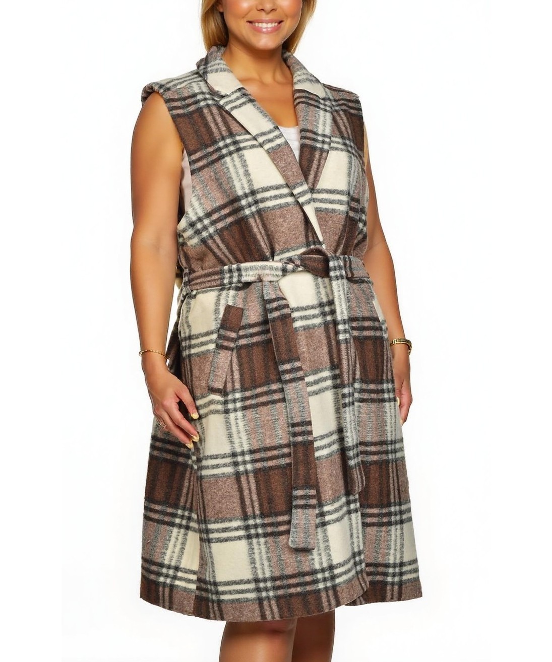 Елегантен дамски елек без ръкави от мек вълнен плат с кафяво-екрю каре. Дължина до коляното, колан в талията и дискретни джобове. Топъл, стилен и подходящ за сезонна визия. Подходящ за офис и ежедневие.