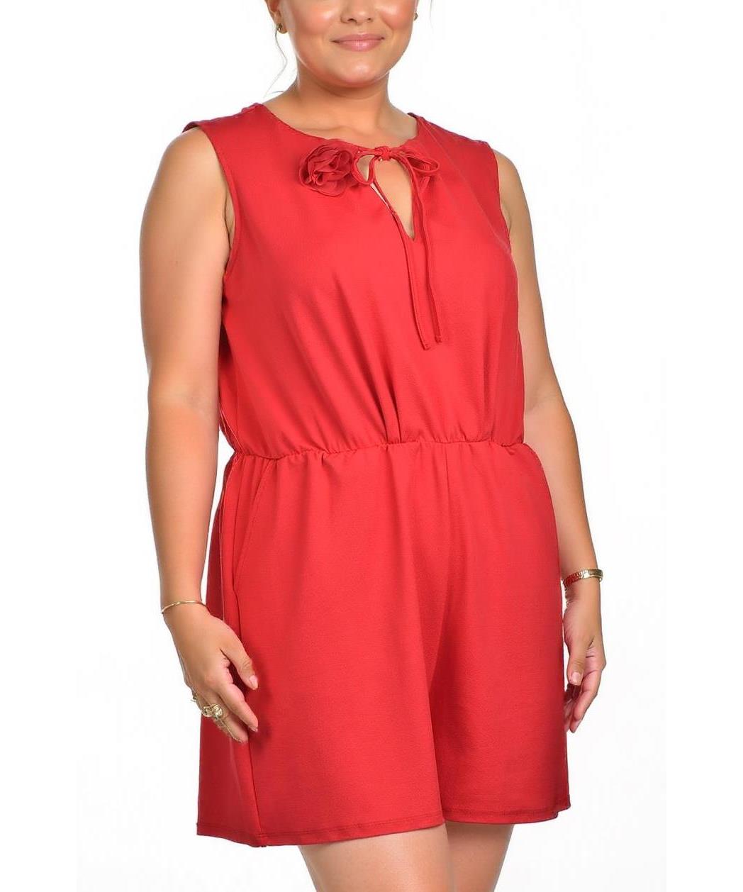 Описание на продукта: Стилен дамски гащеризон в жив червен цвят, изработен от лека и удобна материя. Моделът е без ръкави, с декорация от връзка и еластична талия, която придава удобство и елегантна визия. Подходящ за летни излизания и ежедневна употреба.