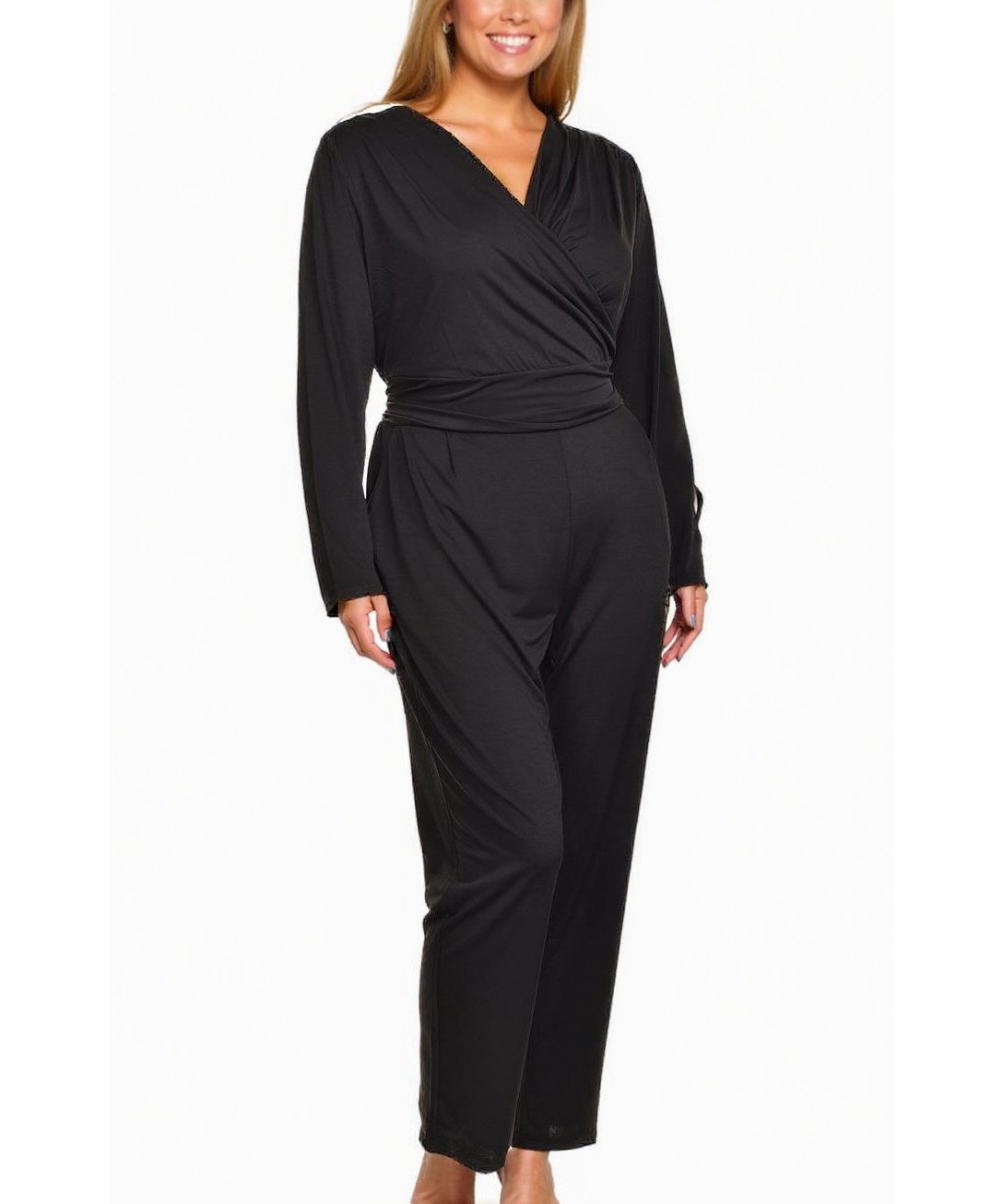 Елегантен дамски гащеризон в класическо черно, с прегърнато V-образно деколте, дълги ръкави и оформена талия с колан. Мека, еластична материя за комфорт и стил при работа или специални поводи. Налични