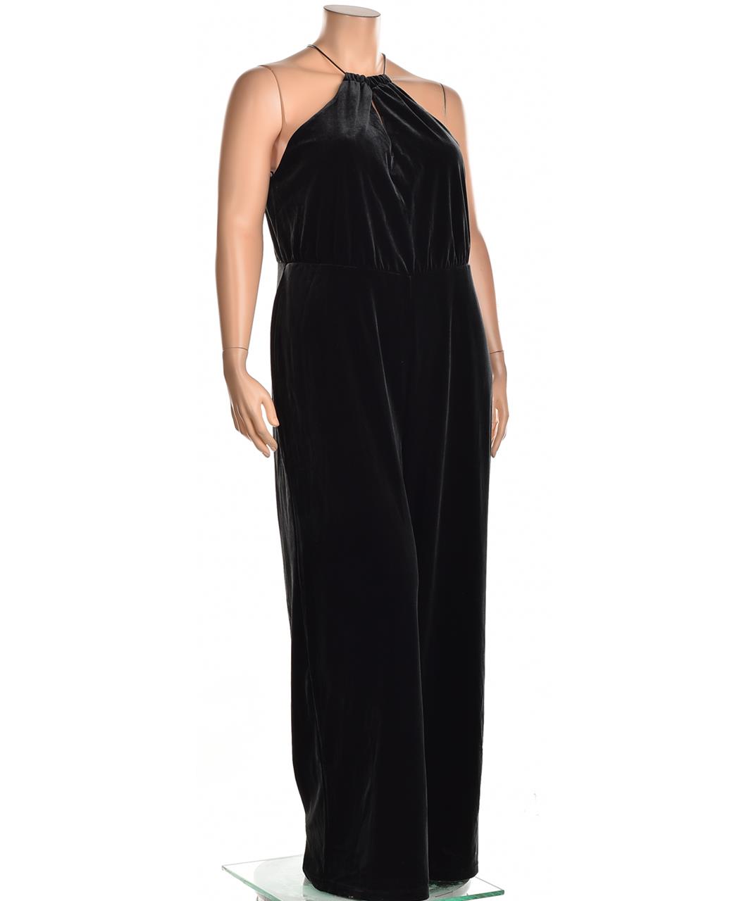 Елегантен дамски гащеризон от черно кадифе, без ръкави, с халтер деколте и широки крачоли. Подчертана талия и мек допир, перфектен за вечерни и официални събития. Стилен избор за партита и коктейли.!!