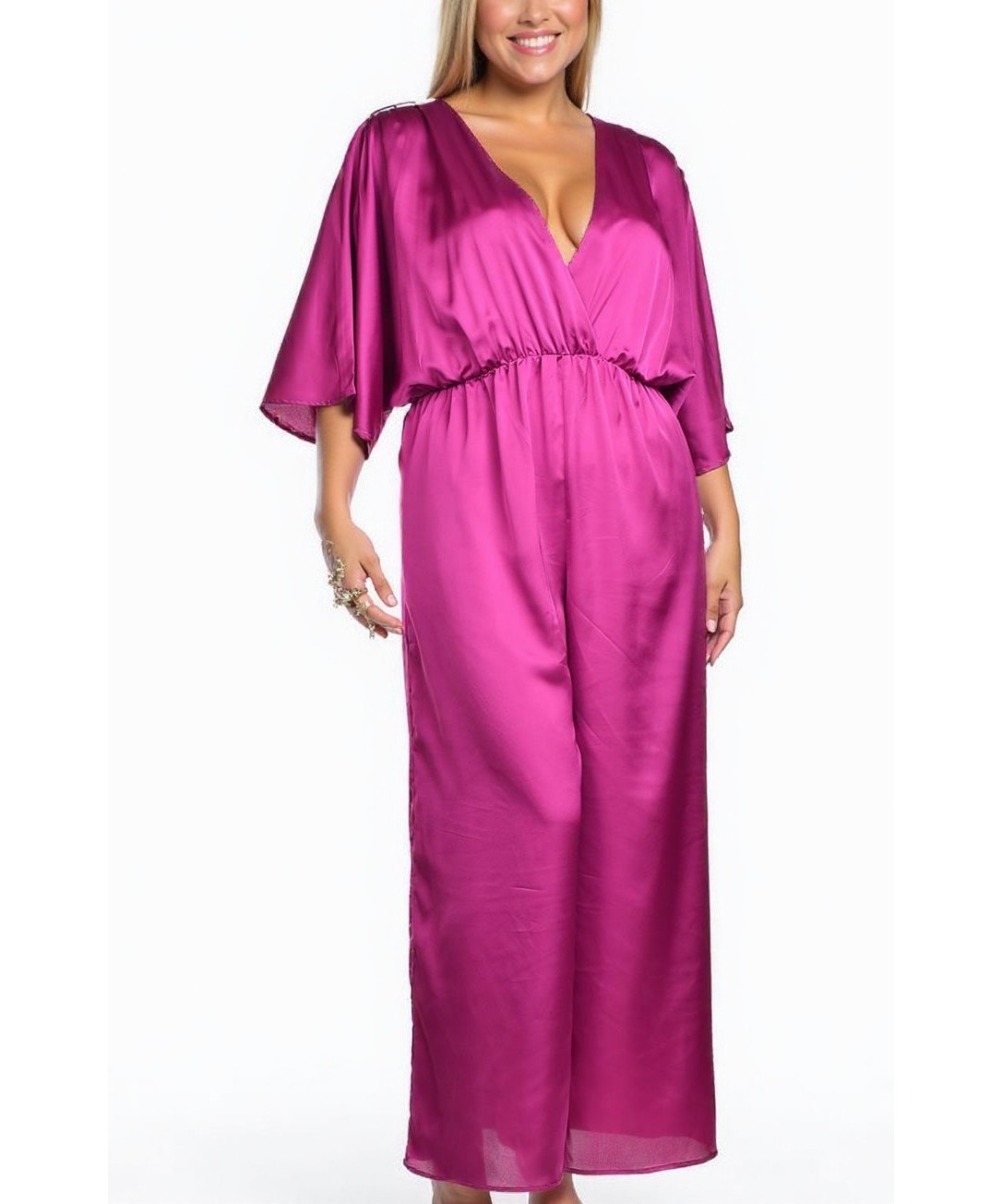 Елегантен дамски гащеризон в наситен лилав цвят. С разкроени ръкави и дълбоко V-образно деколте. С висока талия и свободна кройка, която осигурява комфорт и стил за специални поводи.