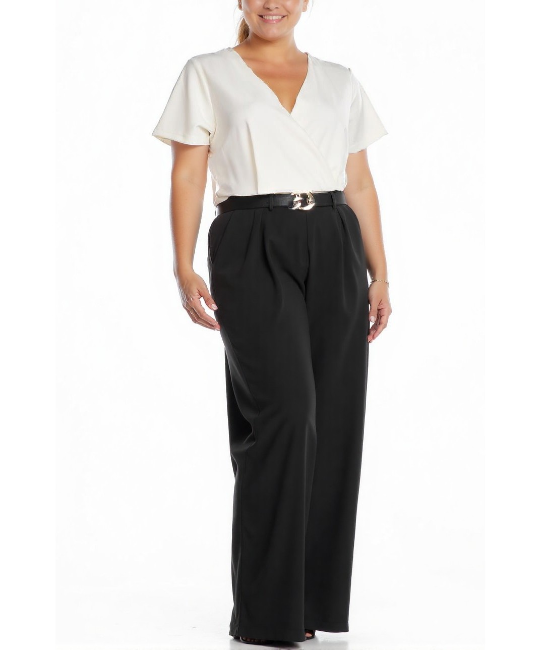 Елегантен дамски гащеризон в бяло и черно с къс ръкав и V-образно деколте. Широки панталони с изтънчена талия и ефектна метална катарама – перфектен за офис и официални събития. Удобен и стилен избор.