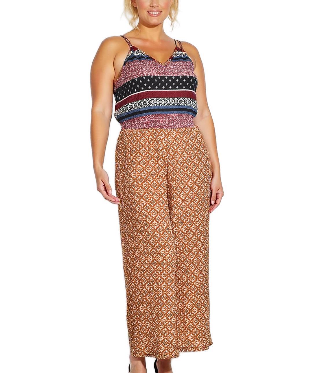 Изискан дамски гащеризон с ефектен дизайн, съчетаващ различни шарки и цветове. Горната част е с тънки презрамки и геометрични мотиви, докато панталоните са с флорален принт в земни тонове. Подходящ за лятото.