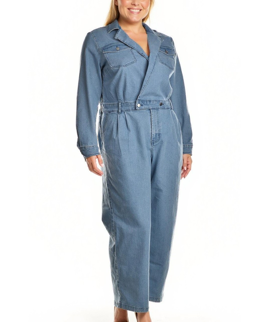 Елегантен дамски гащеризон от мека памучна материя в светло деним, с дълъг ръкав, ревера, копчета и висока талия. Удобен, със странични джобове и закачлив винтидж стил за всеки ден. Перфектен избор!!!