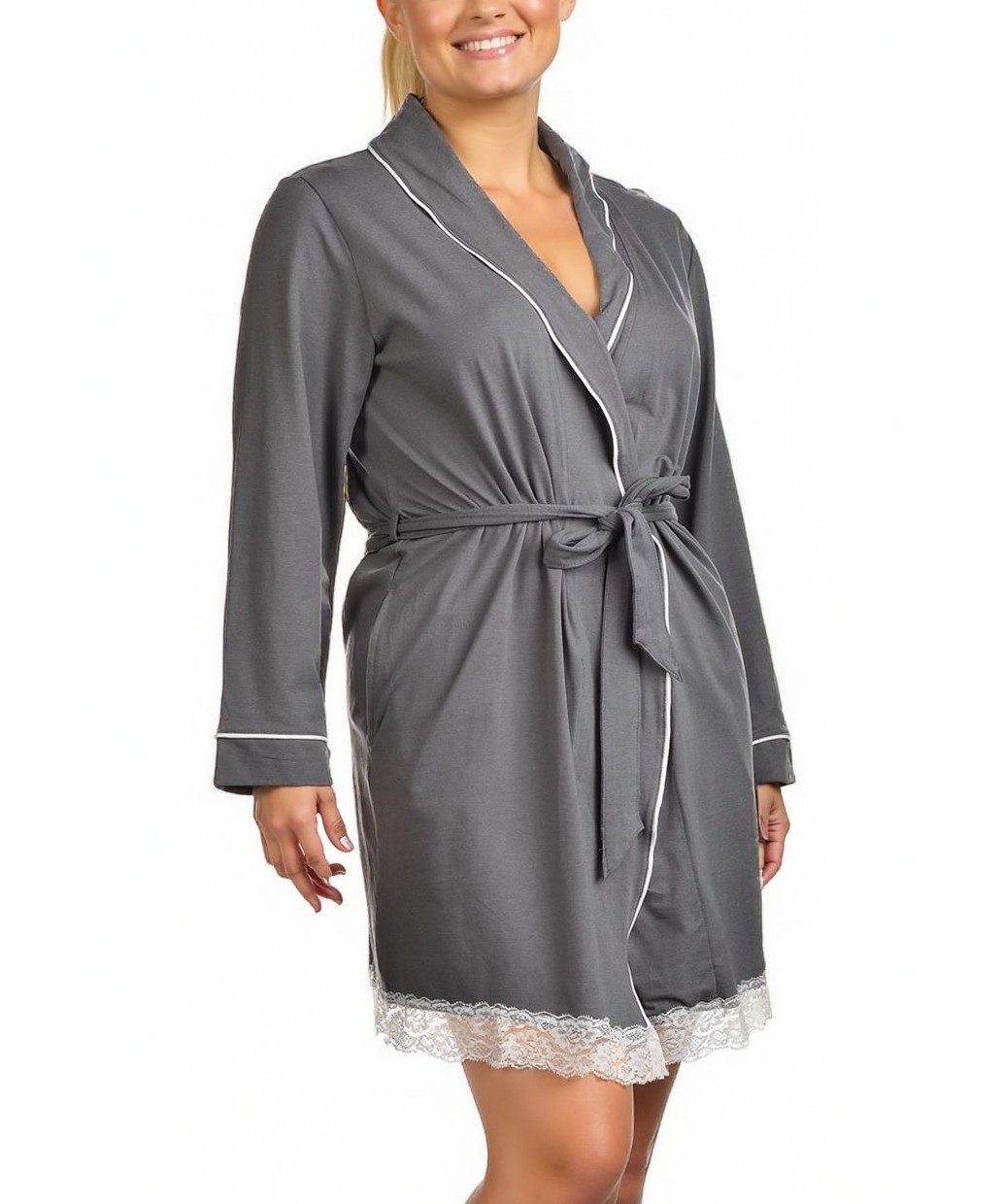 Дамски памучен халат в сиво с бяла кантова обшивка и деликатна дантела. Мек, дишащ и удобен крой, с колан и джобове. Идеален за релакс у дома и при ежедневна употреба. Лятна мека материя, лесна поддръжка.