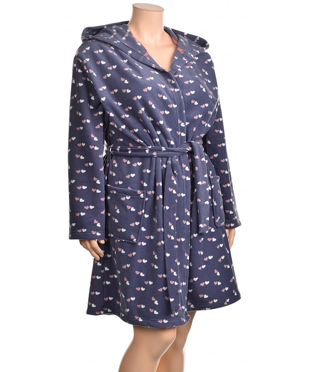 Дамски памучен халат с качулка, колан и два предни джоба. Мек и удобен, тъмносин с деликатен десен от малки сърца. Къс модел до коляното, идеален за уют и релакс вкъщи след баня. Подходящ за подарък!!!