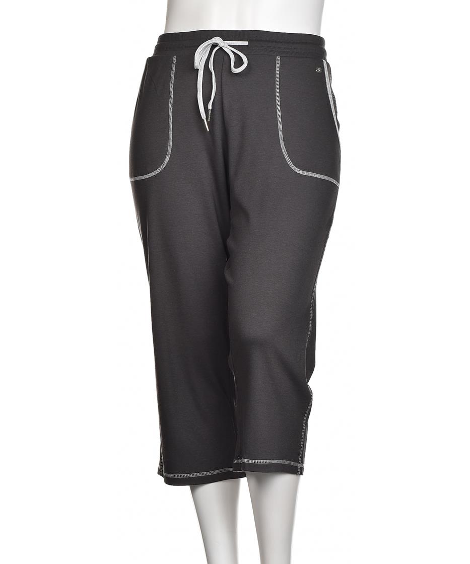 Дамски три-четвърти панталон от памук в черен цвят. Има еластична талия с връзки за регулиране и бели декоративни шевове. Подходящ за спорт или ежедневие, осигурява комфорт и стил.