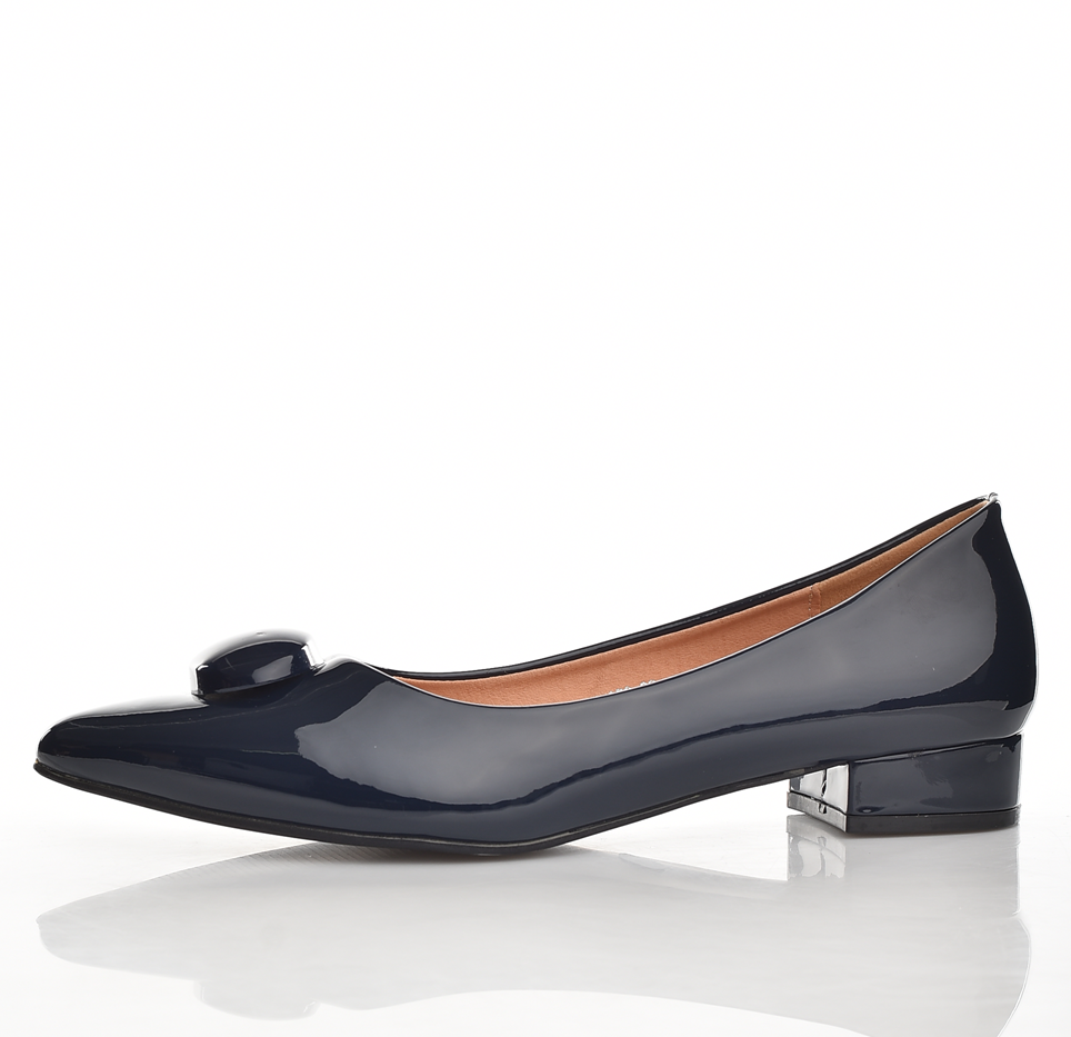 Елегантни дамски обувки от естествена кожа с лаково покритие, нисък квадратен ток, заострен връх и стилна декоративна капса. Удобни, подходящи за всеки ден и официални поводи. Бляскав тъмносин нюанс.
