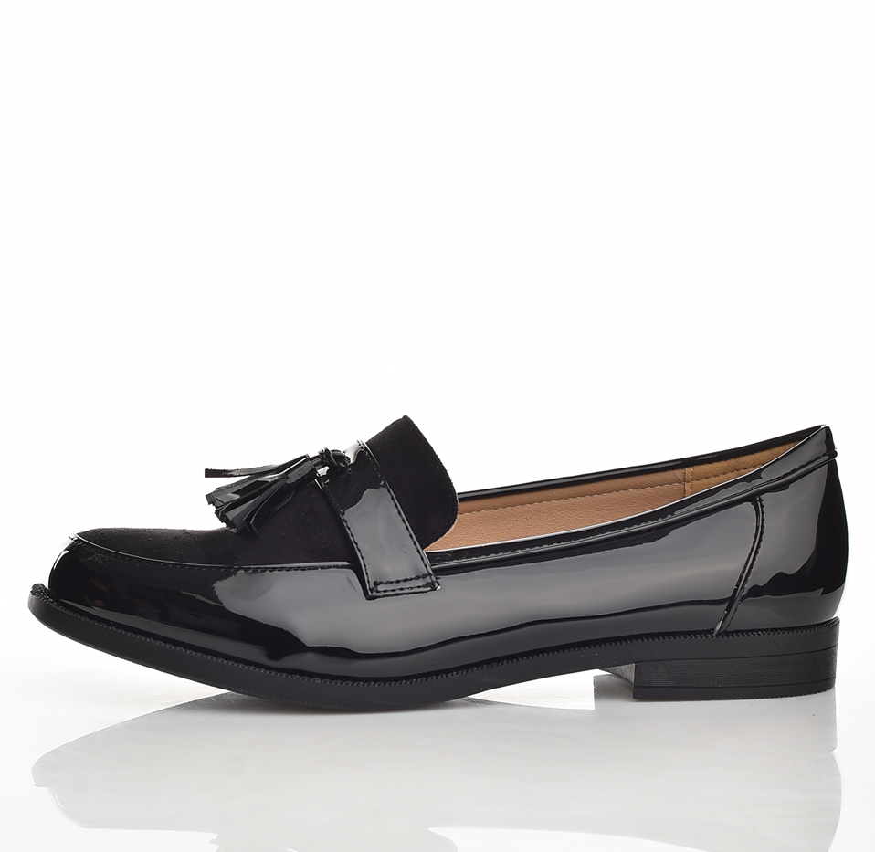 Елегантни дамски мокасини от естествена кожа с лакова визия и декоративни пискюли. Удобни, с мека стелка и нисък ток — перфектни за работа и ежедневни стилни комбинации.