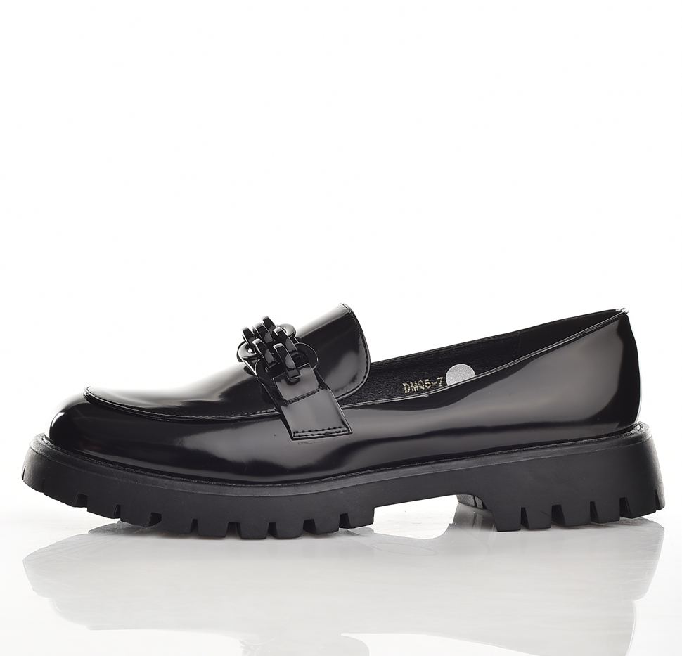 Елегантни дамски кожени мокасини в класическо черно с лъскава лицева част, модерен масивен грайферен подметка и декоративна катарама. Удобни, устойчиви и подходящи за всеки повод