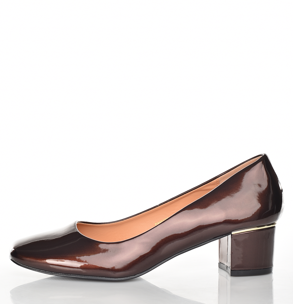 Елегантни дамски обувки от естествена кожа с лъскаво покритие в дълбоко кафяво. Удобен широк ток 4 см, мека вътрешна подплата и класическа линия – идеални за офис и официални поводи. Изтънчен комфорт.