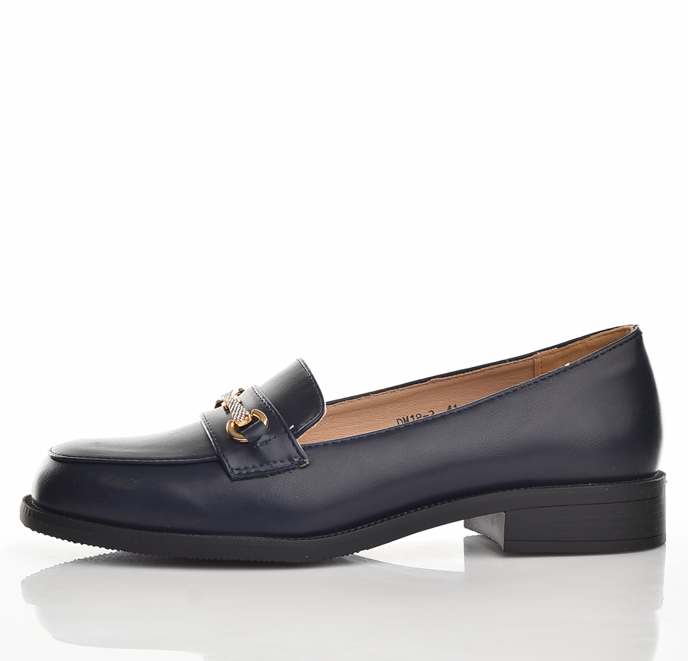 Елегантни дамски кожени мокасини в тъмносин цвят с нисък ток и златиста апликация. Класически силует, мека вътрешна подплата и издръжливо ходило – идеални за офис и ежедневни визии. Отлични за всеки ден