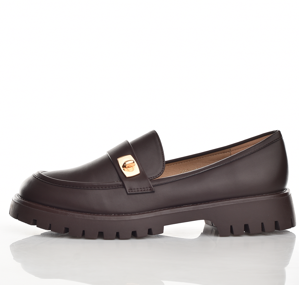 Елегантни дамски кожени мокасини в тъмно кафяво с модерно дебело грайферно ходило и златисто копче. Комфортни, стилни и устойчиви за всекидневна употреба — перфектни за офис и свободно време. Удобни!!