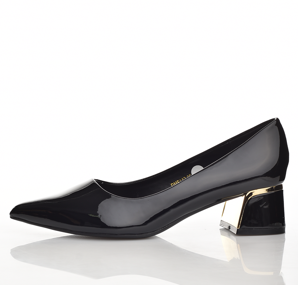 Елегантни дамски кожени обувки в черен лак с остър връх и удобен нисък ток с метален златист акцент. Перфектни за офис и коктейл, съчетават стил и комфорт. Висок клас кожа и устойчиво качество. И стил.