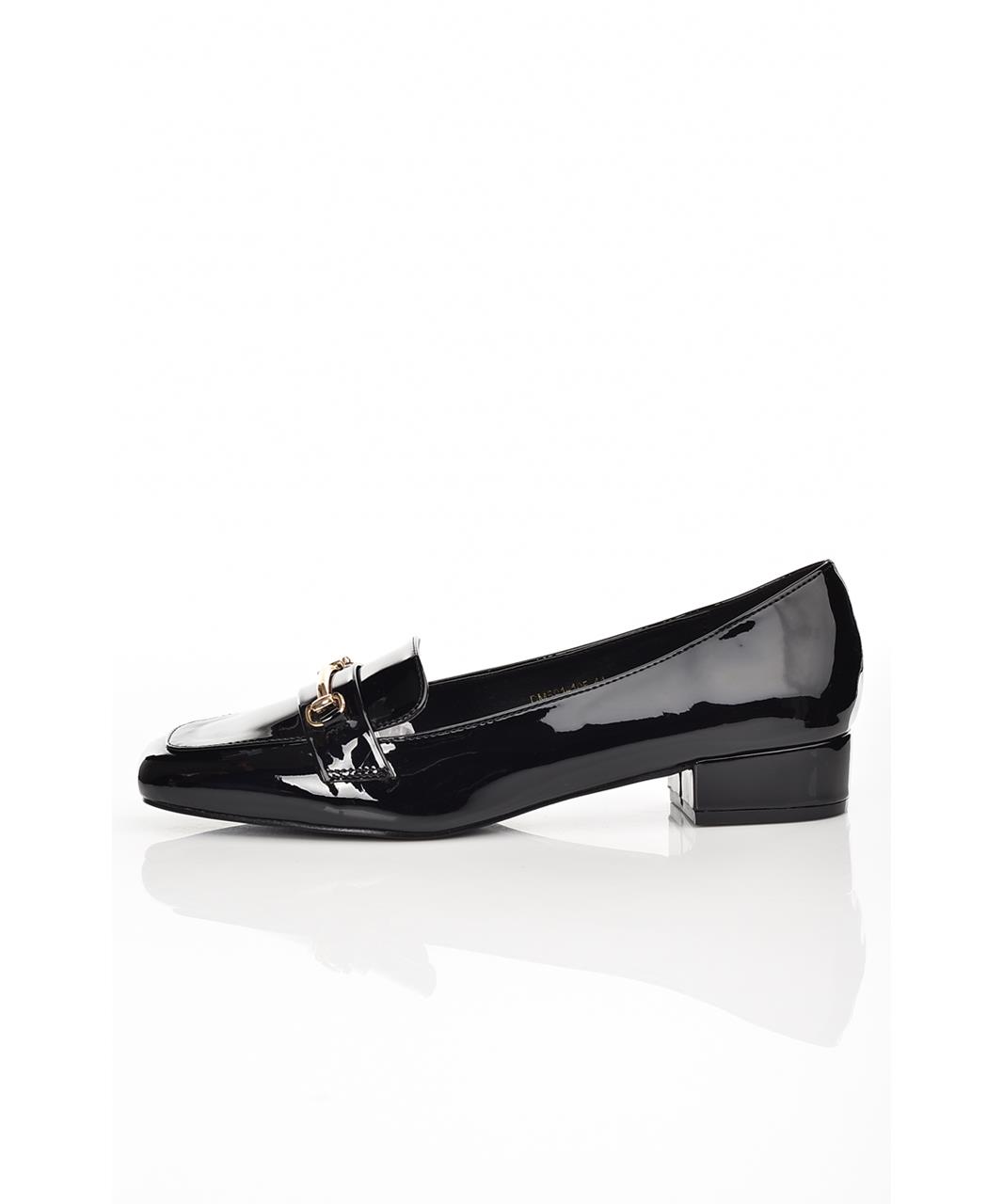 Елегантни дамски лачени обувки от естествена кожа с нисък широк ток, удобна остра линия и златиста метална декорация. Подходящи за офис и ежедневие, предлагат стил и комфорт през целия ден. Гаранция