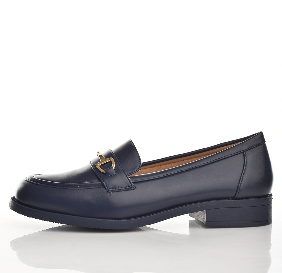 Стилни дамски мокасини от естествена кожа в тъмносиньо с елегантна златиста катарама. Комфортна подметка и нисък ток, подходящи за офис и ежедневие. Лесни за поддръжка и налични в разнообразни номера.