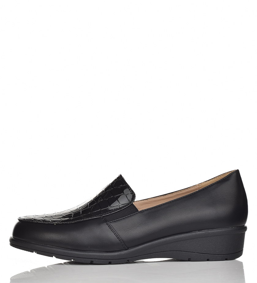 Елегантни дамски мокасини от еко кожа в черно, с лачен кроко ефект на върха и удобна ниска платформа. Стилен ежедневен модел с мека стелка и устойчива подметка. Перфектни за офис и ежедневни разходки.