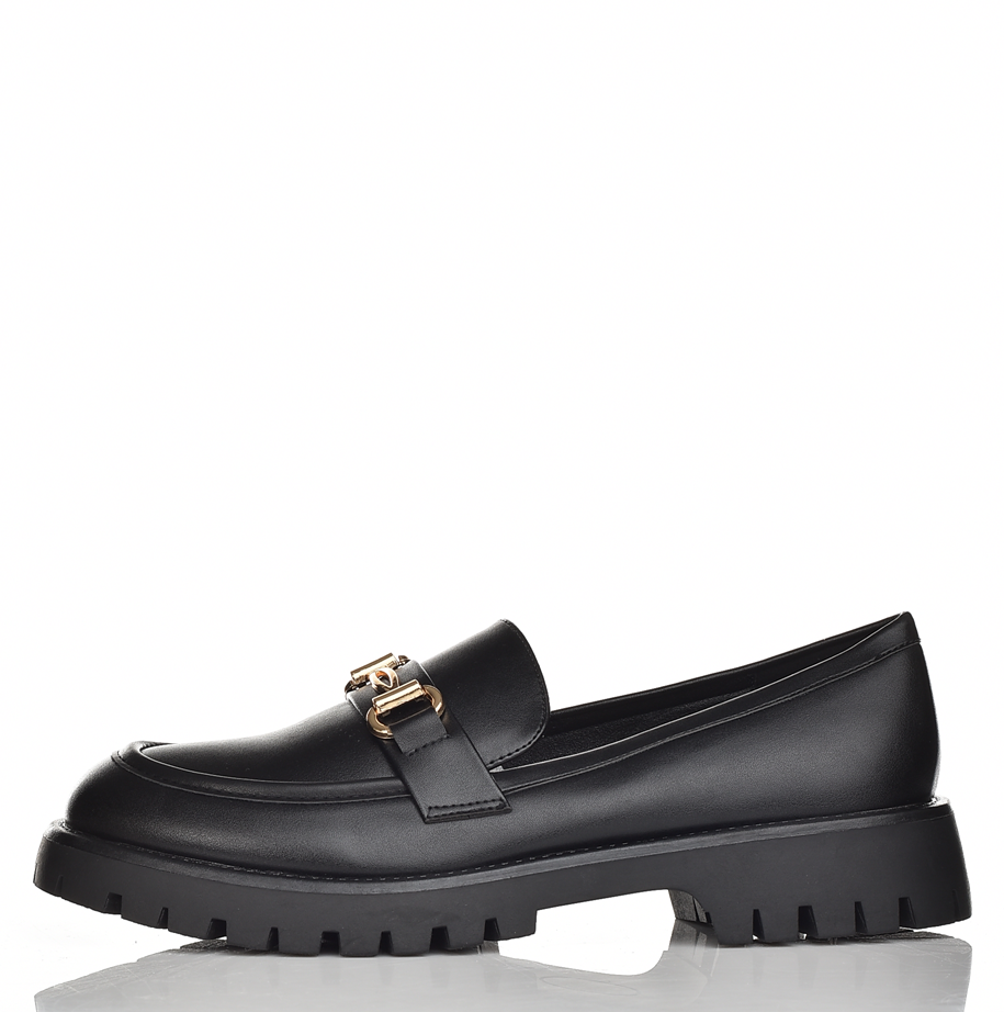 Дамски мокасини от еко кожа в класическо черно, с масивна грайферна подметка и златиста халка. Удобни, модерни и лесни за съчетаване с ежедневни и официални тоалети. Лека подметка, устойчива и стилна.