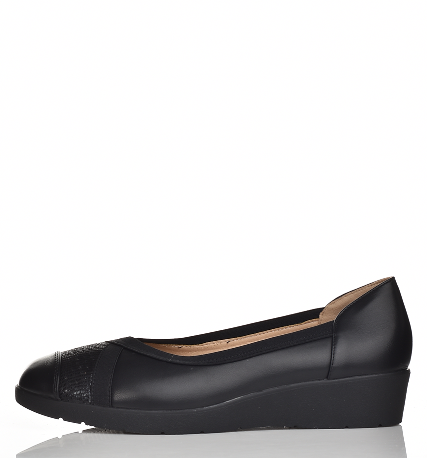Елегантни дамски обувки от еко кожа, черни, с ниска клиновидна платформа, мека стелка и заоблен връх. Подходящи за ежедневен и официален стил, леки, удобни и издръжливи. Подходящи за целодневно носене