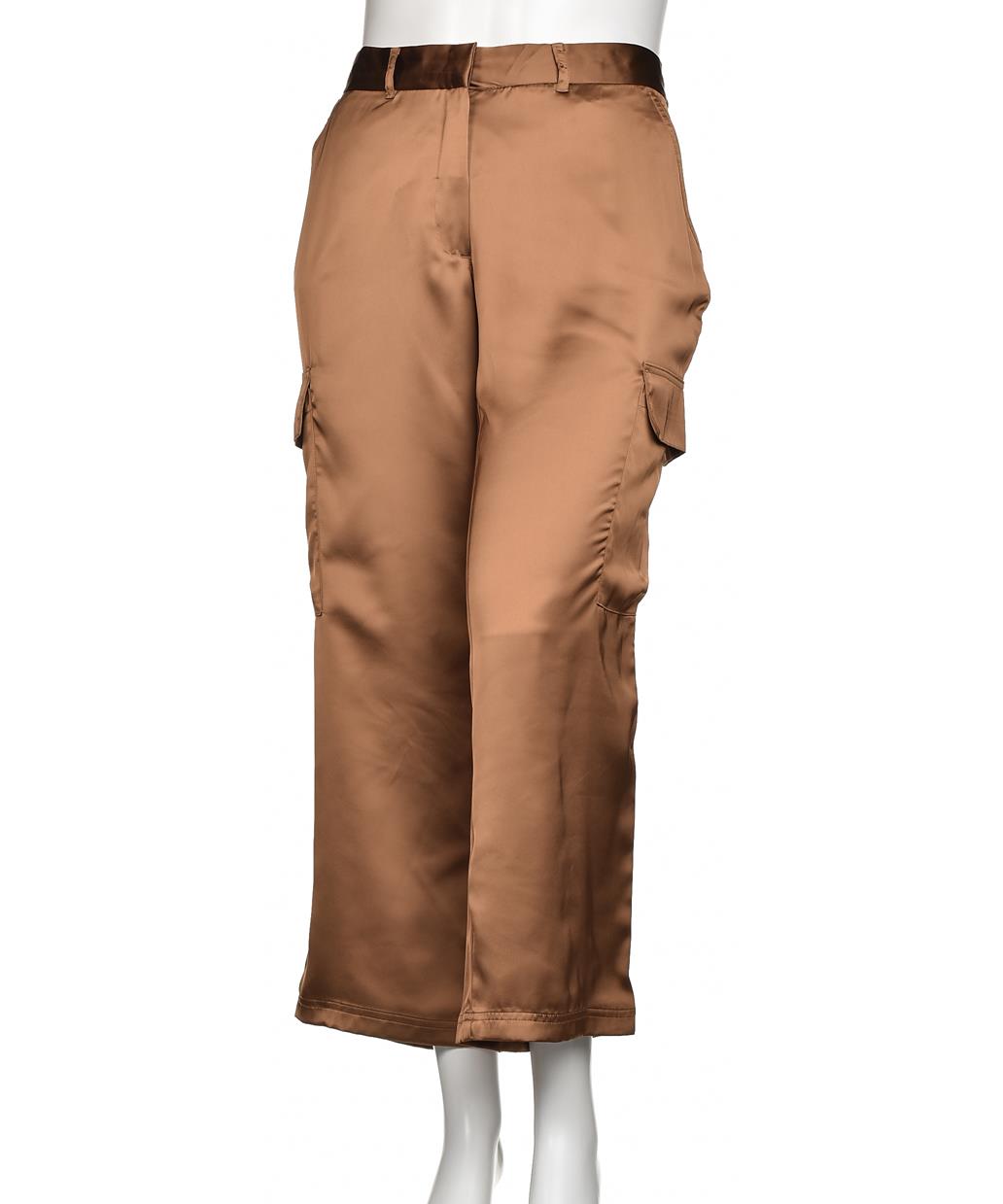 Кадифени дамски панталони в топъл кафяв нюанс. Прав и свободен силует, къс крачол, странични джобове с капаци и коланена талия. Гладка лъскава материя, подходящи за ежедневна и офис визия. Стилно!!