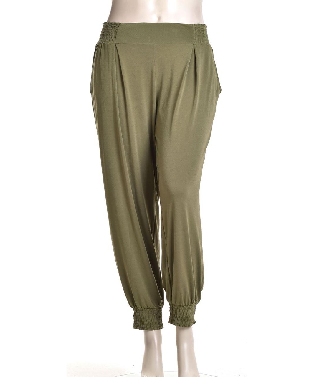 Модерен дамски панталон в маслено зелено с еластичен колан и маншети, свободен падащ силует, мека, еластична материя и джобове. Идеален за всеки ден и пътуване. Лесни за комбиниране, подходящи за оф.