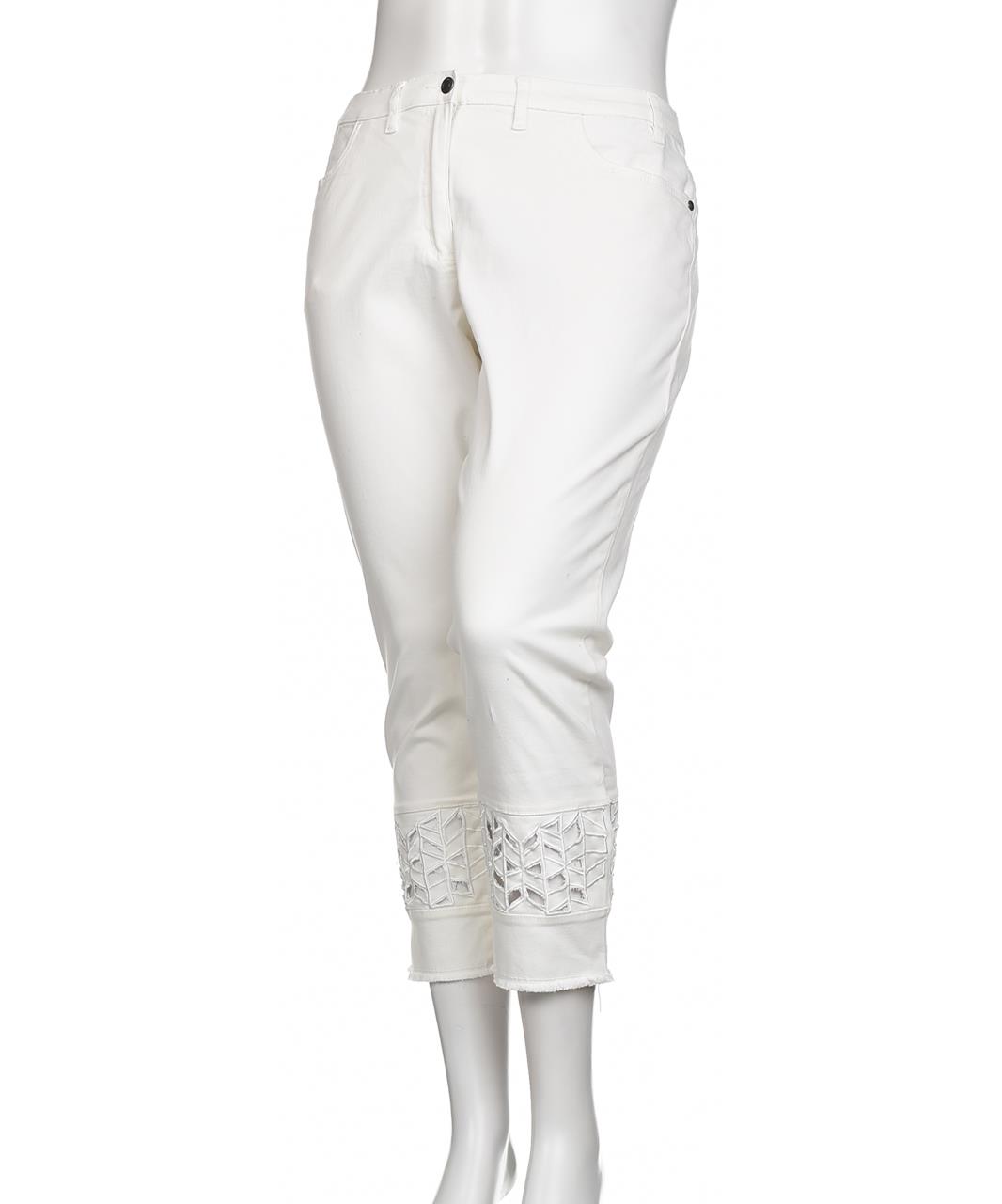 Дамски памучен панталон, в бял цвят. Дължината му е три четвърти, завършва с декоративни елементи на маншетите. Подходящ за ежедневно носене, предлага комфорт и стилна визия.