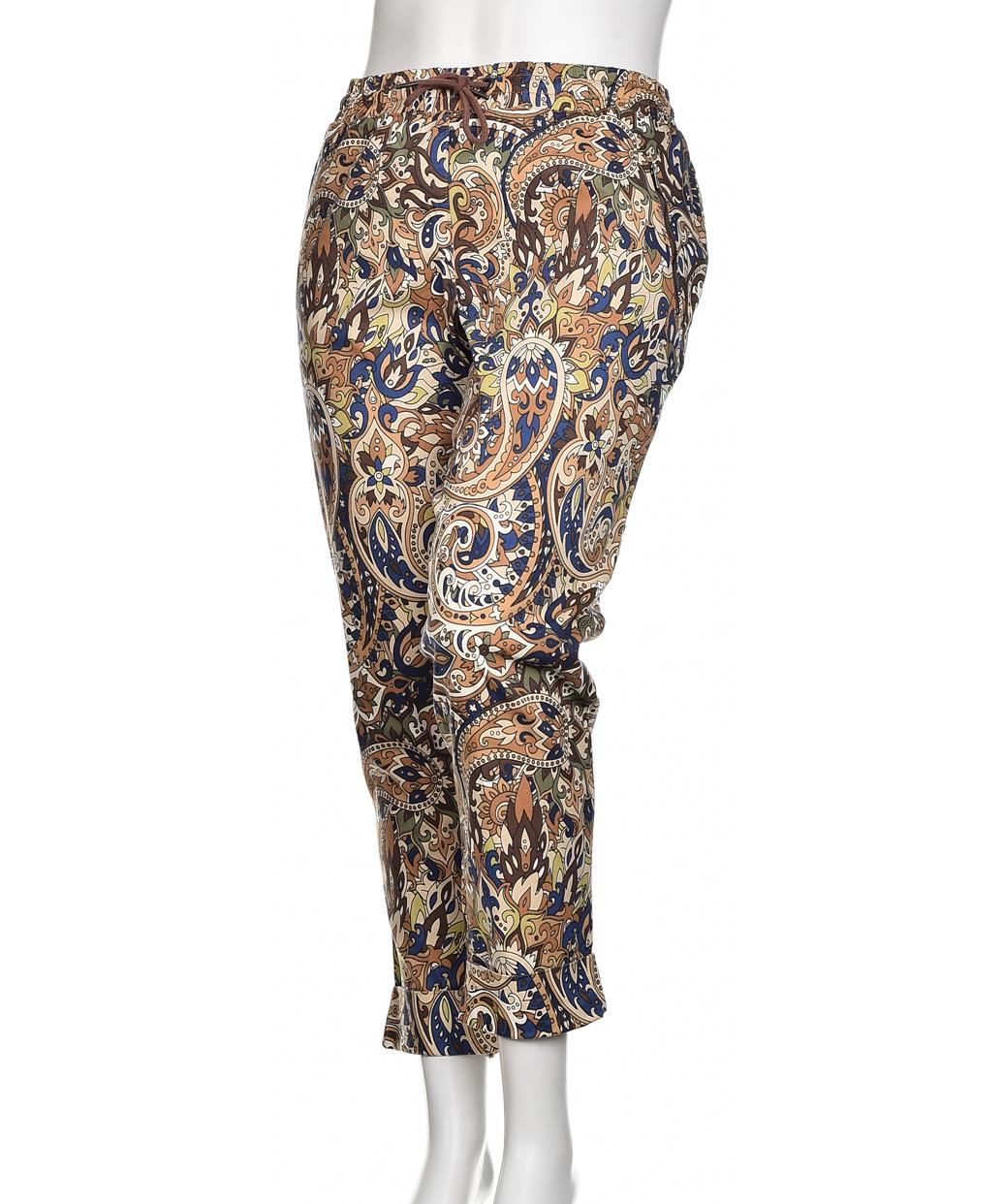 Дамски памучен панталон с еластична талия и връзка, комфортно право пасване. Богат пейсли десен в топли земни тонове, подходящ за всеки ден и елегантни небрежни визии. Лека материя, перфектни за лято.