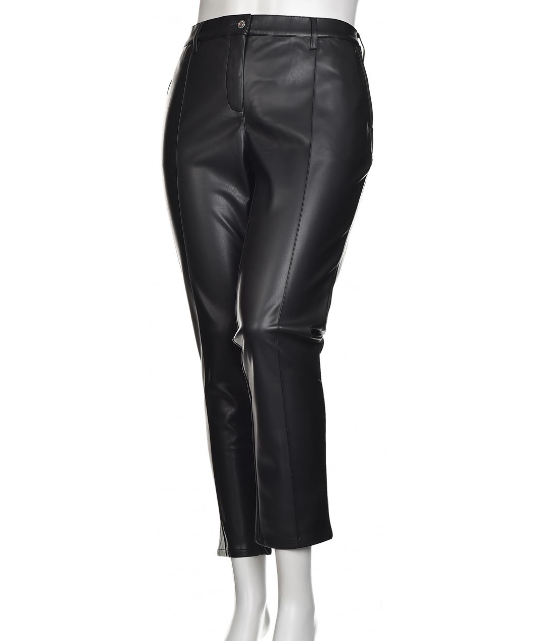 Дамски панталон от еко кожа в черно. Прав силует до глезена, средна талия, предни кантове, коланова шлица с копче и цип. Модерен, елегантен и удобен за всеки ден и излизане. Перфектен за офис и парти