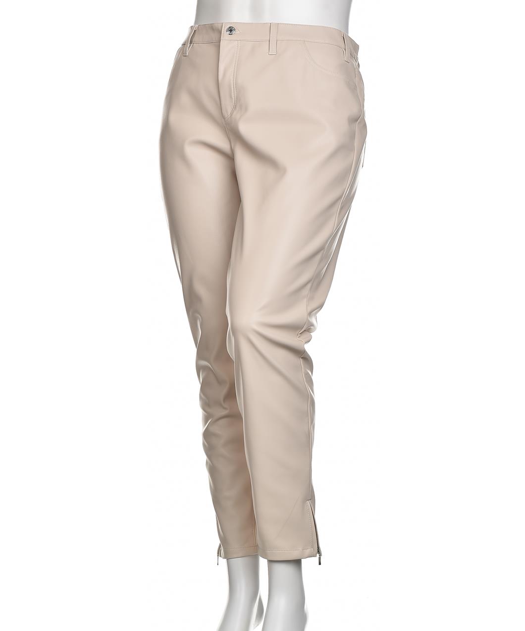 Дамски панталон от еко кожа в светъл беж, тесен силует до глезена, средна талия, джобове и халки за колан. Крачолите завършват с цип за стилен и практичен вид. За офис и вечерни визии и парти визии.