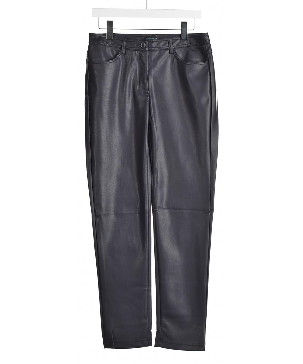 Дамски панталон от еко кожа в наситено черно. Прав силует с класическа талия, коланни халки, предни джобове и цип с копче. Модерен, лесен за комбиниране и идеален за ежедневен и вечерен стайлинг. С ефектен блясък