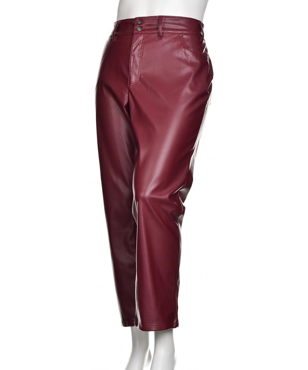 Дамски панталон от еко кожа в наситено бордо. Висока талия, вталена кройка, странични джобове и закопчаване с цип и двойно копче. Модерен, с лек блясък, удобен за всеки ден. Подходящ за офис и вечер.