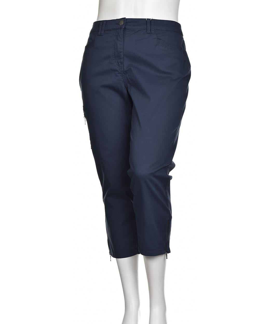 Дамски памучен панталон в тъмно синьо, 7/8 дължина. Прав силует с удобна талия, копче и цип, странични джобове и ципове на крачолите. Идеален за ежедневие. Меко, дишащо, лесна поддръжка. Размери S-XL.