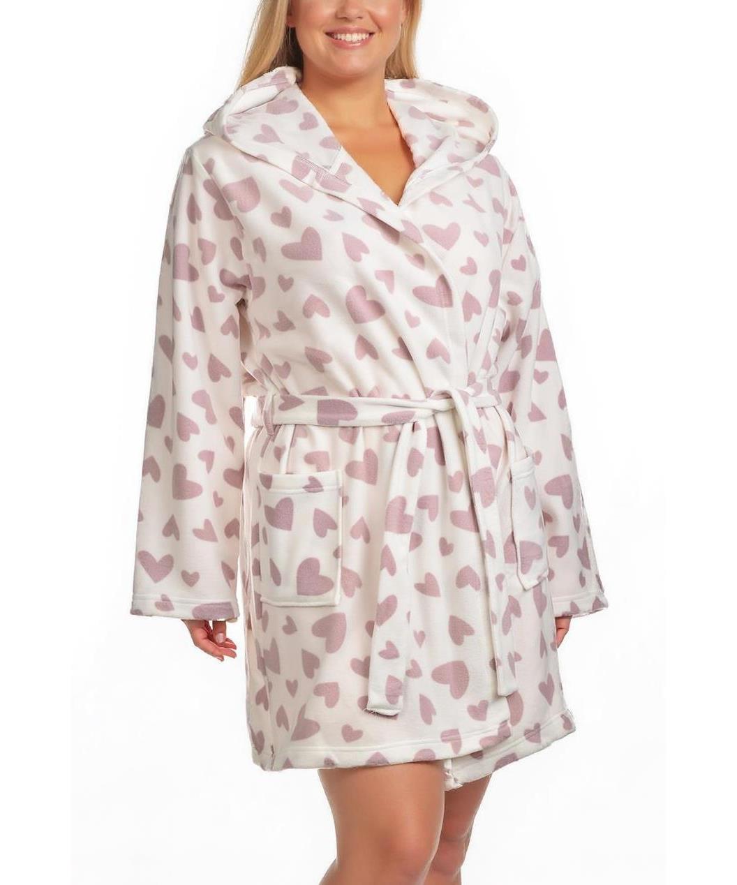 Дамски плюшен памучен халат с качулка, колан и джобове. Мек, топъл и приятен на допир, с нежни розови сърца върху светъл фон. Идеален за у дома, след баня и за релакс. 100% памук, наличен в S-XXL...