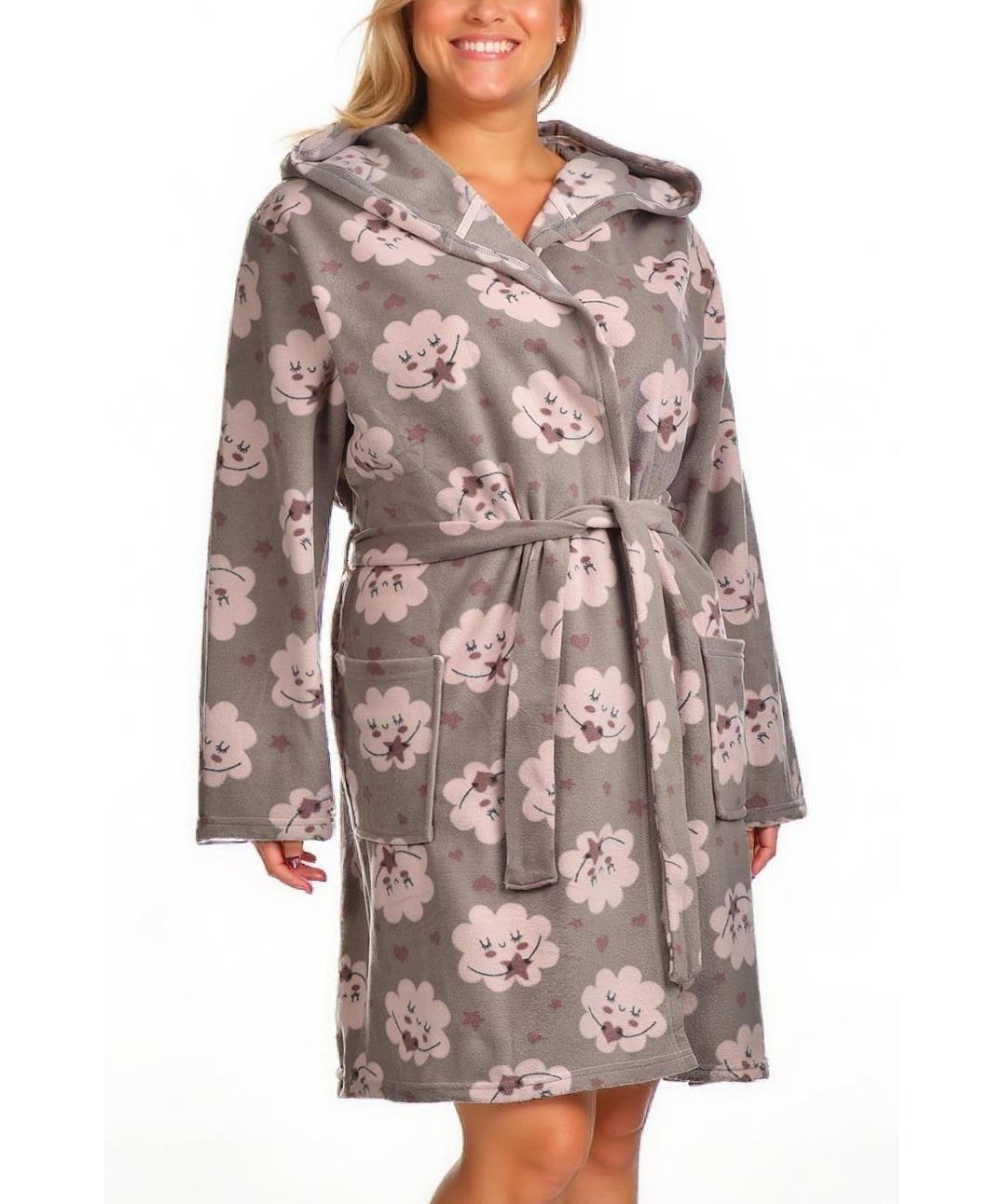 Дамски плюшен халат от памук, мек и топъл, с качулка, колан и два джоба. Ефектен десен с усмихнати облачета. Удобен, до коляното, перфектен за дома и подарък. Лесна поддръжка, подходящ за всички сезони