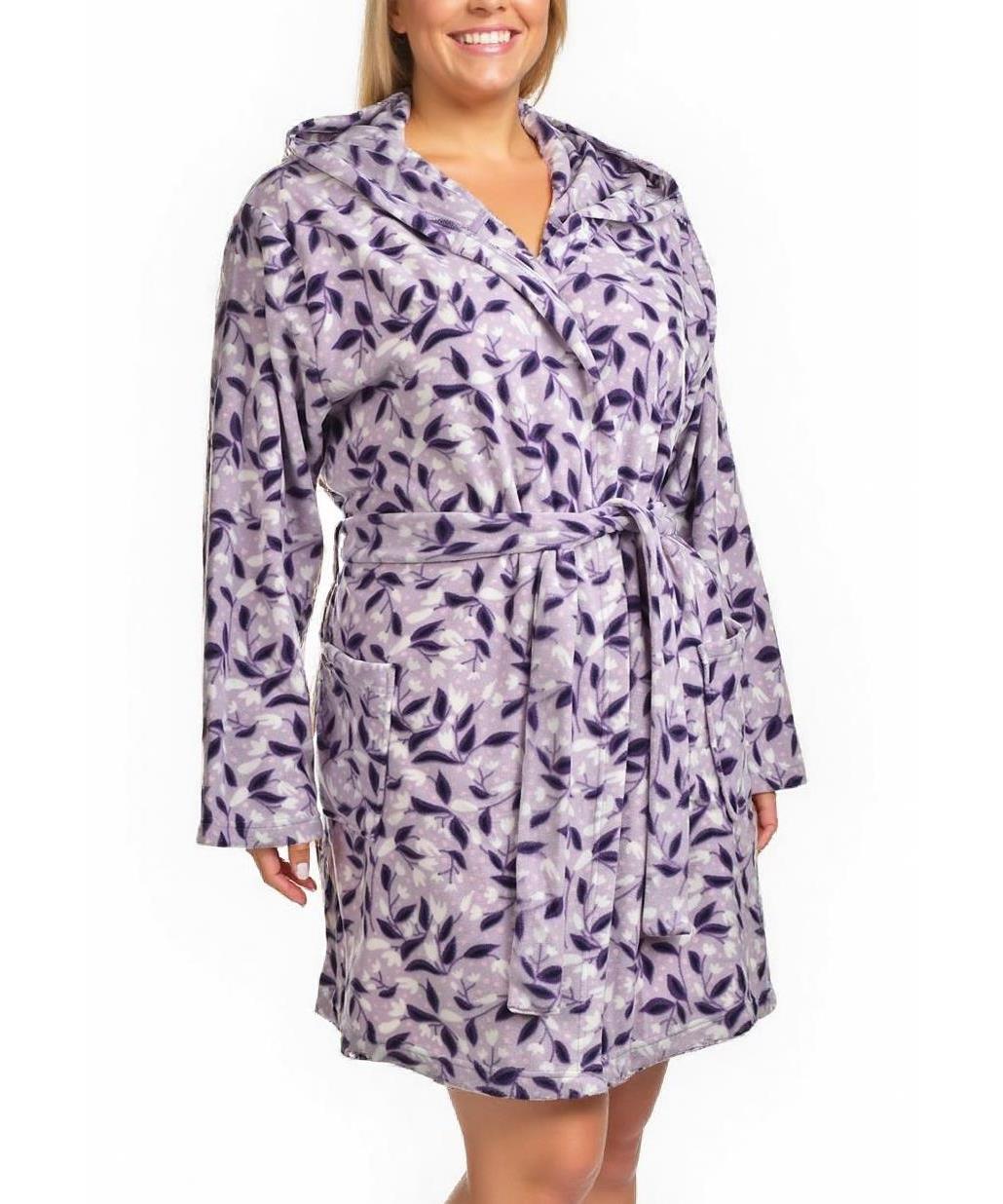 Плюшен дамски халат от памук с нежен лилав листен десен. Мек, топъл и абсорбиращ, с качулка, джобове и колан. Удобен за вкъщи, SPA и подарък. Налични размери. Бърза доставка. Лесна поддръжка и пране.!
