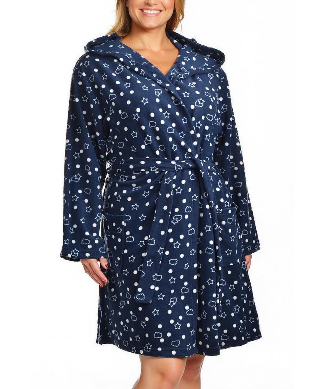 Дамски плюшен халат от памук - мек и топъл, с качулка, колан и джобове. Тъмносин десен със звезди и точки, удобна кройка за домашна релаксация и комфорт през целия ден. Машинно пране, пази мекотата