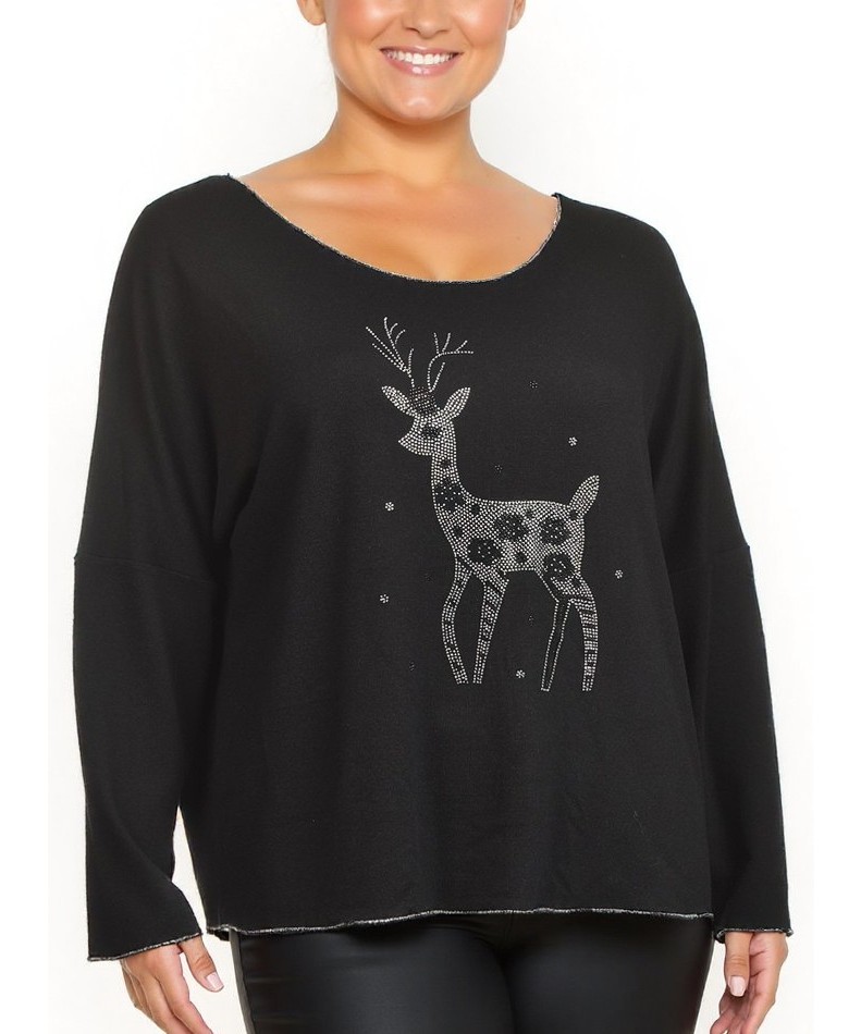 Черен дамски пуловер от вискоза с ефектен елен от ситни кристали отпред. Свободна кройка, мека и приятна на допир, подходящ за ежедневно и празнично носене. Луксозен блясък и комфорт. Елегантна визия!!