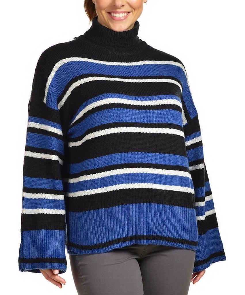 Топъл дамски пуловер от вълна с поло яка, широк силует и паднали рамене. Дебела плетка в синьо, черно и бяло райе, рипсен подгъв и дълги ръкави за уют и стил. Подходящ за всеки ден и студени вечери!!!