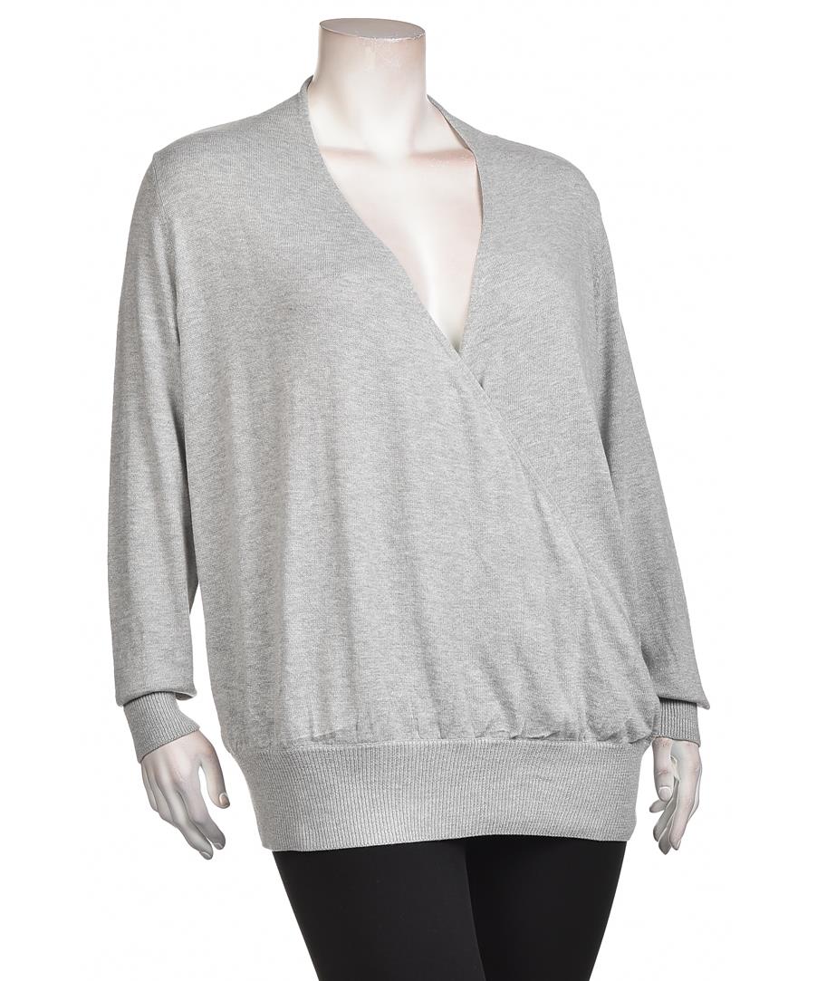 Дамски памучен пуловер с ефектно пресичане отпред, V-образно деколте и свободна кройка. Мек, дишащ и лесен за комбиниране — перфектен ежедневен избор в елегантен сив нюанс Удобен за работа и пътуване