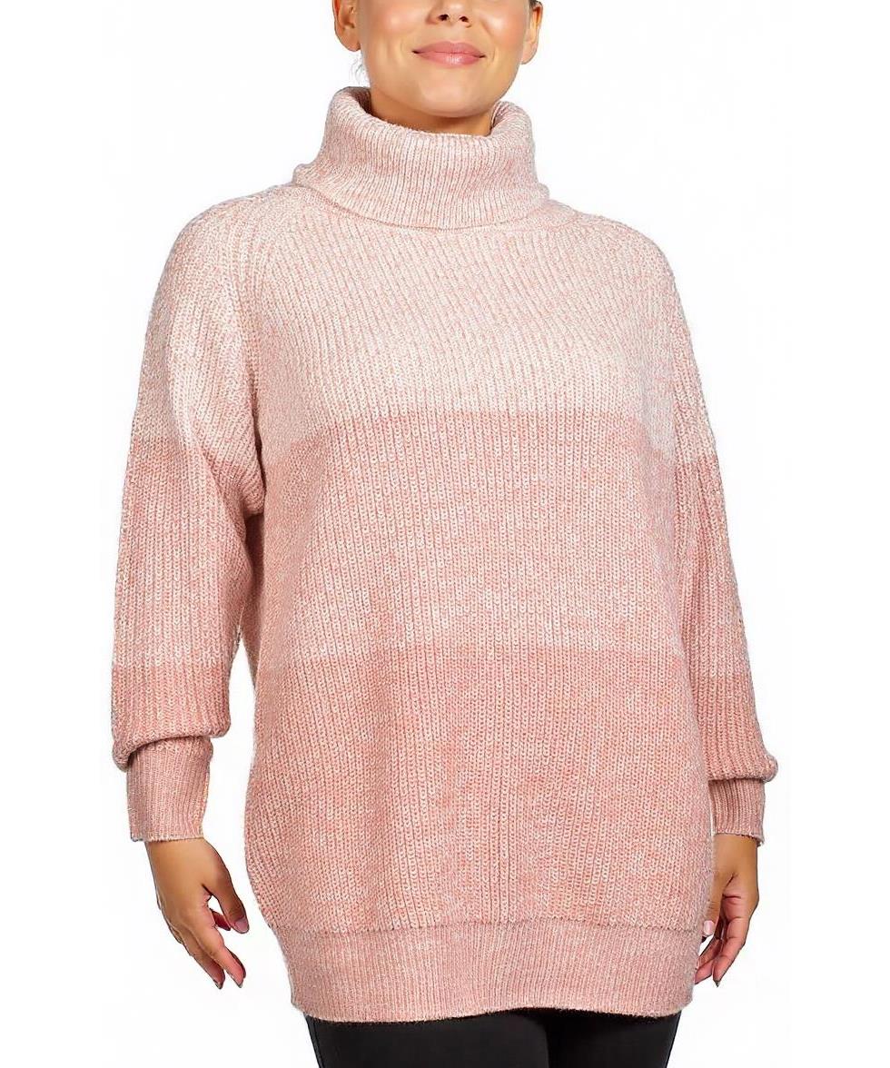 Мек дамски пуловер в прасковено-розов нюанс, с висока поло яка, рипсени ластици на маншети и подгъв. Свободна кройка, топъл, идеален за ежедневие и студените дни.