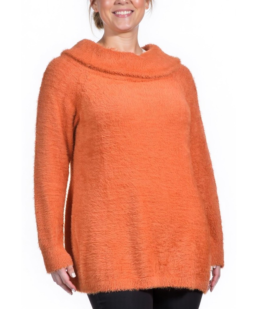 Удобен дамски пуловер от вискоза в топъл коралов цвят. Меко, пухкаво трико с широки ръкави и широка лодка яка. Топъл, елегантен модел за ежедневно носене. Лесна поддръжка и перфектна за студените дни.