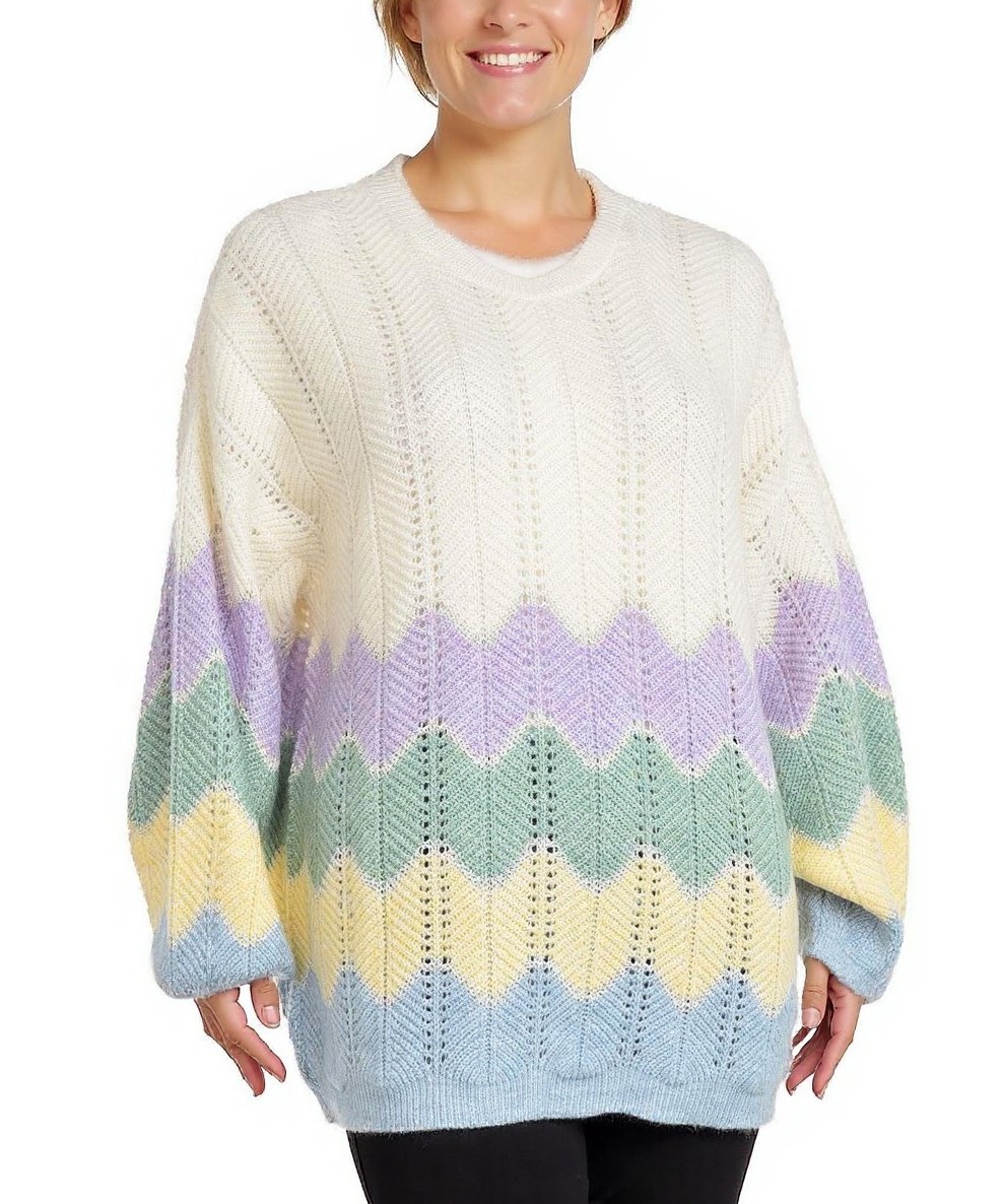 Дамски плетен пуловер в пастелни райета – крем, лаванда, ментово, жълто и светлосиньо. Оверсайз кройка, кръгло деколте и обемни ръкави. Мека, въздушна материя за ежедневно носене. Налични размери S-XL