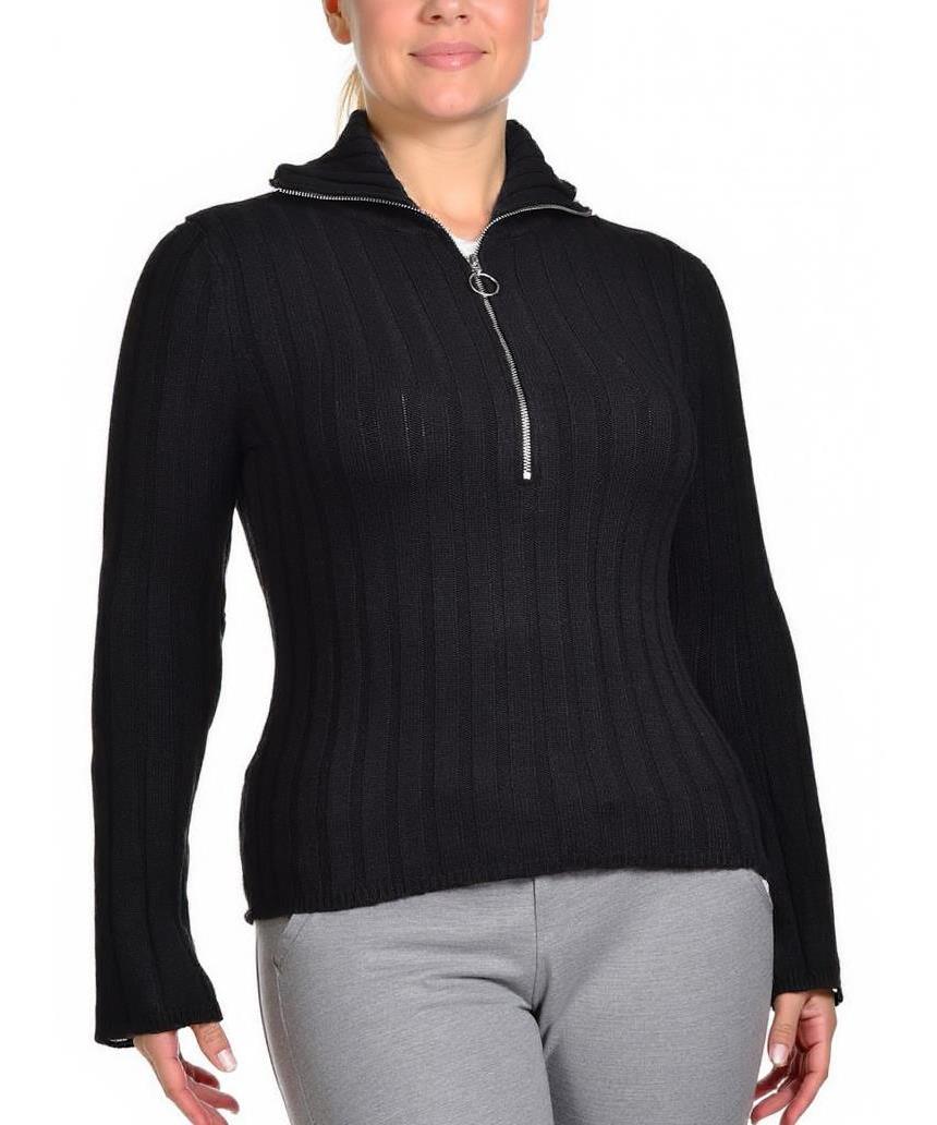Дамски пуловер от вискоза в класическо черно. Мека релефна плетка, поло яка с цип и стилен метален пръстен, прилепнал силует за подчертана талия. Удобен и елегантен избор за всеки ден. Стилен и топъл